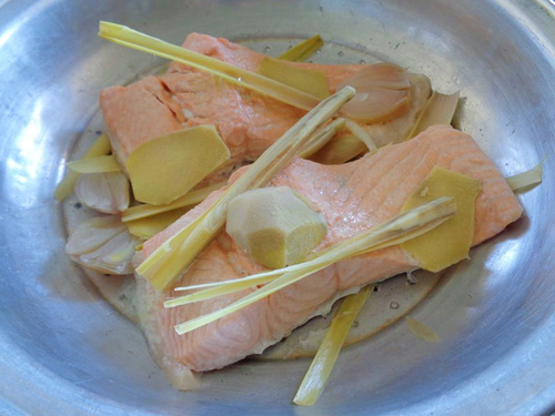 Bước 2: Qua 40 phút, vớt cá ra, dùng khăn lau khô, xếp cá vào dĩa có gừng, rượu, muối, sả đập dập, trộn đều và cho lên xửng hấp chín.