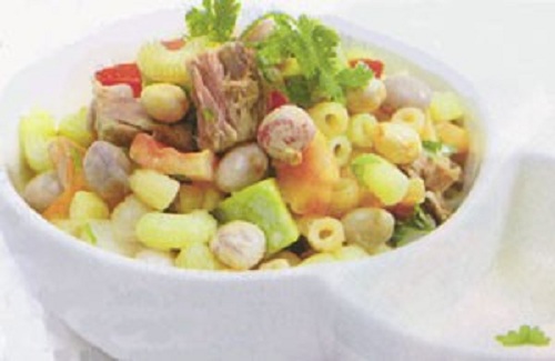 - Nui luộc chín, vớt ra để ráo, rưới ít dầu ăn để không bị dính. Đậu cúc rửa sạch, nấu chín mềm, để ráo. Bơ thái miếng vuông vừa ăn. Cà chua bóc vỏ, thái hạt lựu. Cho nui, đậu cúc, bơ, cà chua, hành tây, cá ngừ vào thố.