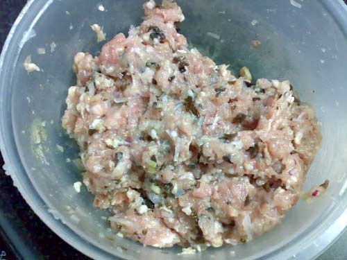Đầu tiên là ướp thịt xay, 200g thịt xay + 1 tai nấm mèo băm nhuyễn + 1 ít bún tàu ngâm nở băm nhuyễn + 1/2 muỗng cafe hành tỏi băm và nêm thêm vào hạt nêm, tiêu, đường cho vừa miệng (đừng nêm mặn nhé). Trộn cho thật đều, ướp 30 phút cho thấm