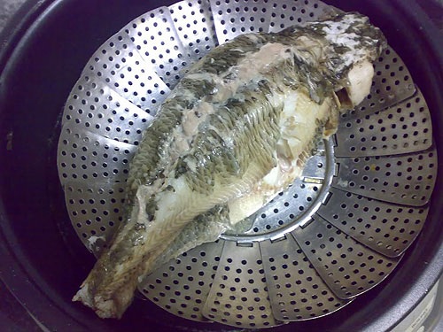 Dồn thịt xay băm đã tẩm ướp vào bụng cá. Lấy kim chỉ may kín phần sống lưng cá lại. sau đó cho lên rọ hấp cá cho đến khi chín có mùi thơm của cá.