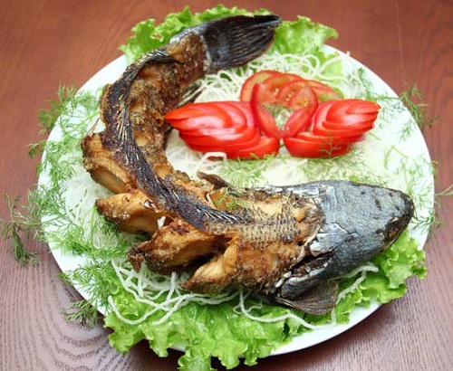 Khi ăn món cá nướng này, bạn dùng bánh đa nem cuốn cá nướng cùng với rau quả đã chuẩn bị và chấm nước mắm chua ngọt nhé.