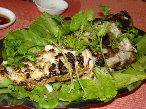 Cá song rửa sạch, cắt miếng vừa ăn, ướp xả, gừng, vỏ chanh và 1 thìa cà phê Hạt Nêm Từ Thịt Knorr, mang nướng chín.