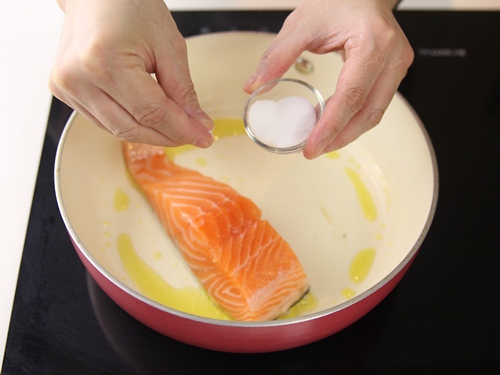 Bước 1: Đun nóng chảo với dầu ăn, cho cá hồi vào chiên với muối và hạt tiêu, nấu trong khoảng 3 phút(cho đến khi mặt miếng vá vàng), sau đó lật cá, chiên tiếp mặt kia cho đến khi cá chín.