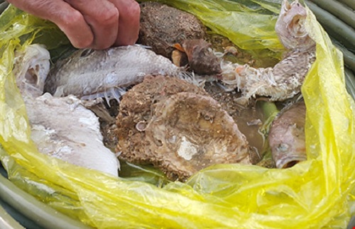 Trên hành trình từ bờ ra tới khu vực lặn, chúng tôi đi qua nhiều vùng nước có mùi hôi thối rất khó chịu. Anh Thùy cho hay chưa bao giờ biển có mùi như vậy, ra tới đây thả lưới một lát là cá, tôm đầy ghe. Nhưng nay thả lưới xuống toàn dính xương cá hoặc cá chết, họa hoằn lắm mới được vài con cá chai, cá đục còn sót lại.