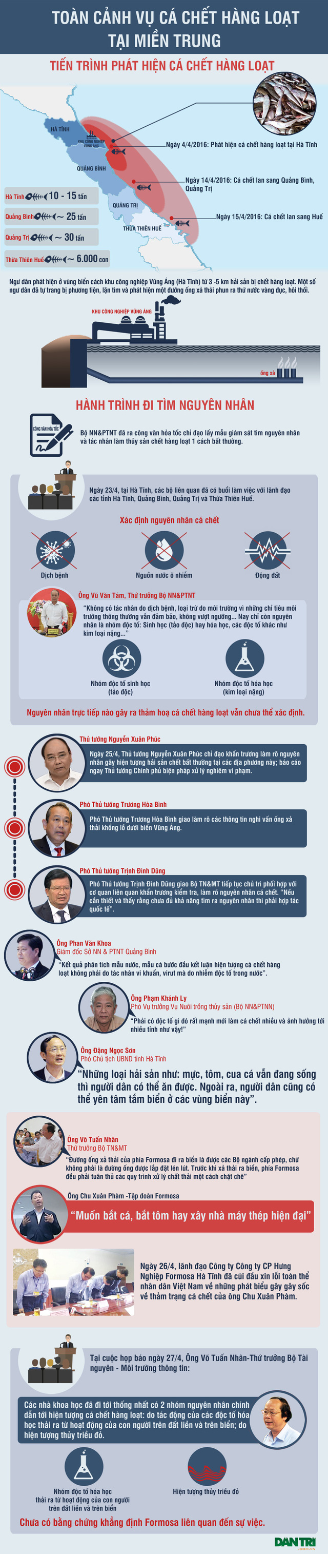 Khoảng 80 tấn hải sản chết bất thường, dạt vào bờ biển miền Trung, lan rộng từ Hà Tĩnh đến Thừa Thiên Huế. Theo những phán đoán ban đầu, phải có một loại độc tố cực mạnh trong nước biển mới khiến cá chết nhiều đến thế. Ngày 27/4, Bộ Tài nguyên – Môi trường công bố 2 nguyên nhân gây nên thảm trang này